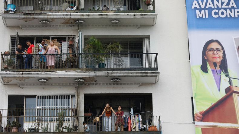 Des habitants observent depuis leur domicile, dans un immeuble décoré d'une banderole à l'effigie de la présidente par intérim du Venezuela, Delcy Rodríguez, à Caracas (Venezuela), le 23 janvier 2026.