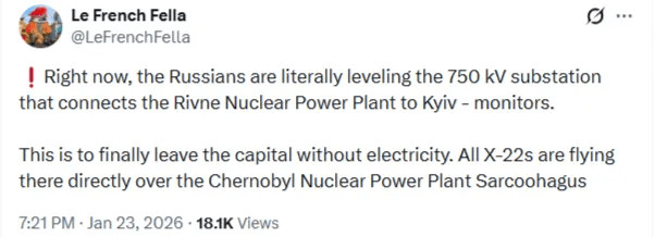 Il nous faut toujours modérer notre enthousiasme et nos attentes, étant donné le temps que nous avons passé à entendre, de la part de diverses autorités des deux camps, que le réseau électrique ukrainien était «enfin au bord» de l'effondrement total. Par exemple, voici une vidéo que j'ai moi-même publiée en 2024, dans laquelle Arestovich affirme que le réseau ukrainien n'était plus qu'à deux ou trois frappes russes de l'effondrement total. Notez en particulier ce qu'il dit au sujet des centrales nucléaires :
