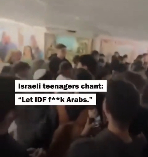 Mais n'allez pas croire que cela choque la société palestinienne. Au contraire. Ainsi des lycéens israéliens ont scandé des slogans génocidaires contre les Arabes après un reportage de la chaîne 14 documenté par B'Tselem, l'ONG israélienne des droits humains, sur la violence des colons en Cisjordanie occupée.