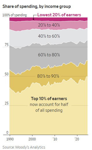 The top 10% of households are also doing extremely well, accounting for fully half of all consumer spending as their earnings, passive investment income and assets all bubble higher.