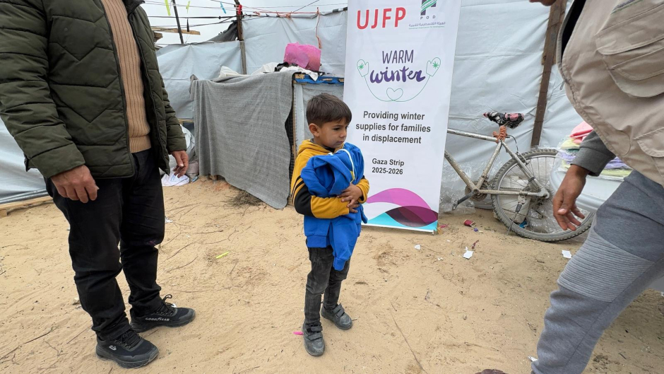 Au milieu de cette réalité difficile, l'initiative Un hiver au chaud, lancée par l'UJFP chaque hiver, est venue comme un rayon de lumière dans l'obscurité hivernale. Nos équipes ont ciblé les enfants des agriculteurs dans le camp d'Al-Rayan situé à la ville de Hamad, qui a rassemblé un grand nombre d'enfants d'agriculteurs dispersés dans d'autres camps de la région d'Al-Mawasi à Khan Younès, et qui n'avaient pas bénéficié de cette initiative auparavant. Nos équipes ont distribué 375 pièces de vêtements d'hiver, transformant ainsi les tentes froides en petits espaces de joie temporaire.