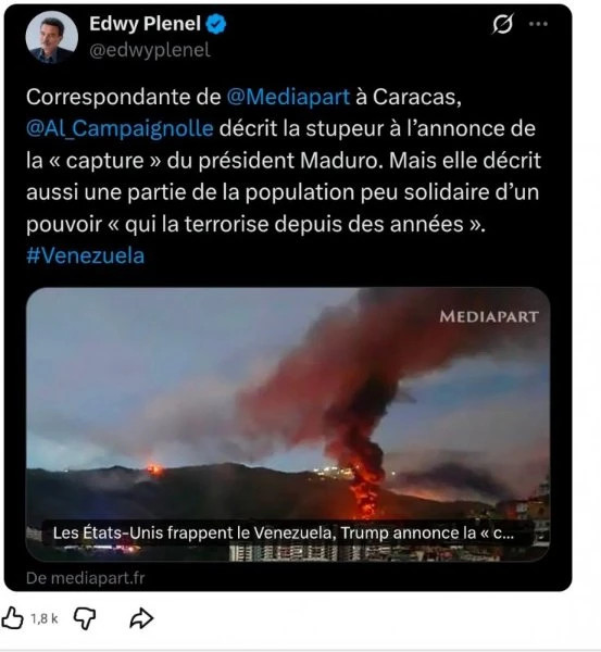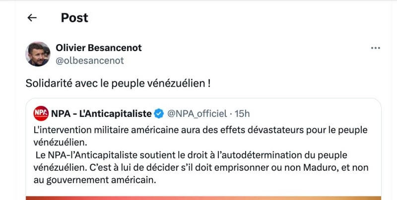 Co-auteur de Che Guevara : une braise qui brûle encore (Mille et une nuits, 2007), Olivier Besancenot lève un poing audacieux tout en évitant précautionneusement de brûler ses petits doigts dans la braise : « Le NPA-l'Anticapitaliste soutient le droit à l'autodétermination du peuple vénézuélien. C'est à lui de décider s'il doit emprisonner ou non Maduro, et non au gouvernement américain ». Besancenot ne précise pas si les Vénézuéliens doivent également envisager l'incarcération de Delcy Rodríguez, proche collaboratrice de Maduro. Le côté féministe du dirigeant néo-trotskiste, vraisemblablement (bien que le sort de Cilia Flores ne semble guère le préoccuper).