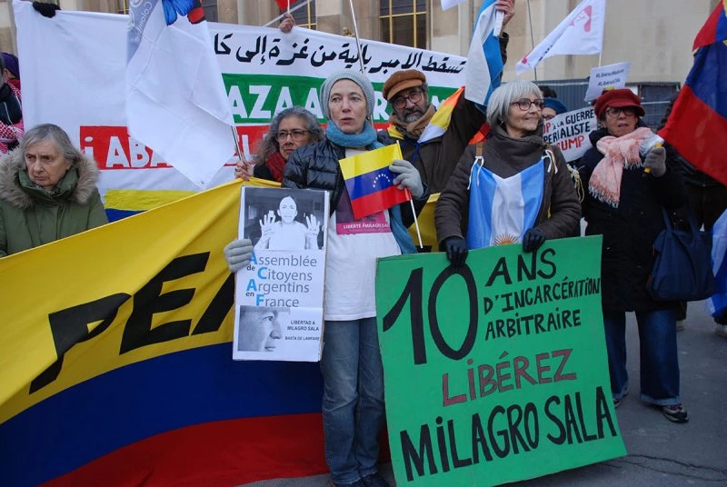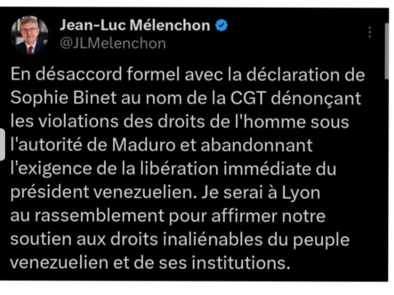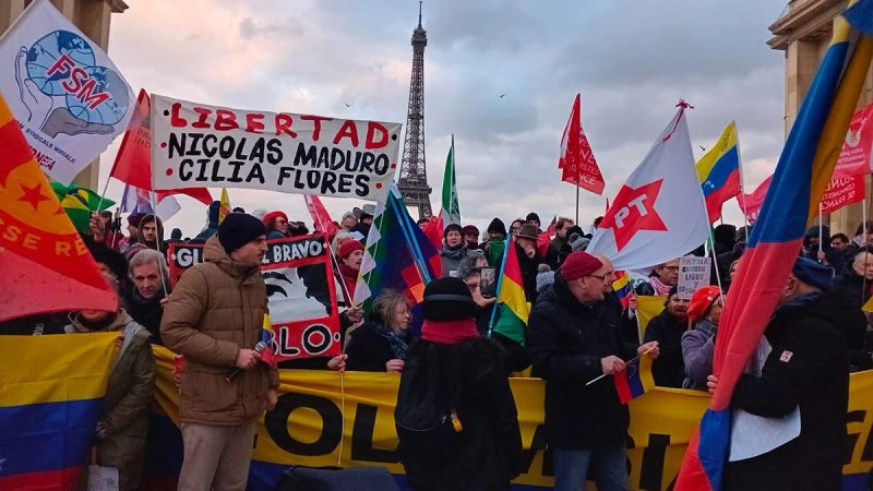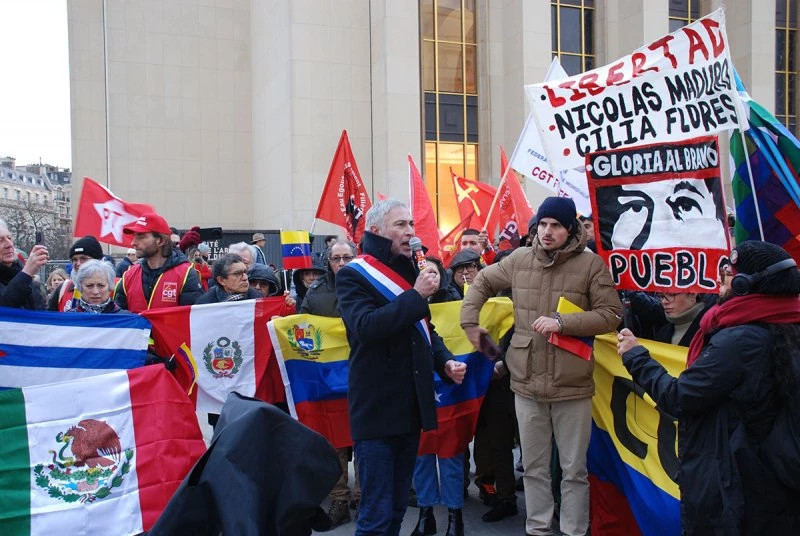 Une manifestation organisée le 10 janvier à Paris, au Trocadéro, par le Collectif international pour la paix au Venezuela - 36 organisations solidaires latino-américaines et africaines [26] - est boycottée par les notables « anti-impérialistes » et la « contra » [27] françaises. Au cours d'une réunion convoquée par le bureau politique de France Amérique latine, il est décidé que la CGT, sous l'autorité de sa secrétaire générale Sophie Binet, appellera à un rassemblement « unitaire » parallèle, à la même heure, à La Bastille, pour dénoncer l'intervention américaine, mais sans réclamer la libération du président vénézuélien.