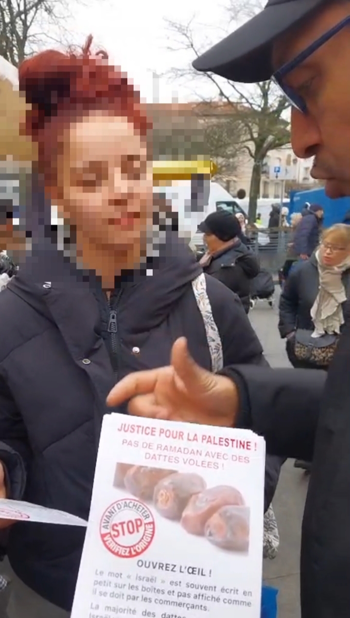 Avant le ramadan, la campagne de prévention est lancée dans toute la France : sur les marchés, dans les magasins, il faut prévenir les consommateurs de ne pas acheter les dattes exportées par Israël et cultivées sur des terres palestiniennes !