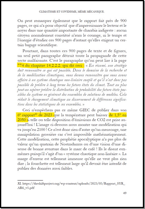 Pourtant ils savent tous que le climat est un système extrêmement complexe, chaotique et non-linéaire donc non prédictible ! C'est juste des statistiques, des chiffres mathématiques théoriques qui ne veulent strictement rien dire. Il suffit de voir combien la météo classique se trompe au-delà de 3 jours pour le saisir. Ainsi, la Doxa a trouvé le moyen de toujours s'en sortir : même si la planète sombrait dans un froid glacial pendant 10 ans causant 7 milliards de morts, elle vous expliquerait - sans rougir - que c'est à cause du «réchauffement climatique» qui a perturbé je ne sais quoi alors qu'il existe des centaines de paramètres tous interdépendants et qu'il est impossible de prédire mathématiquement et statistiquement quoi que ce soit !