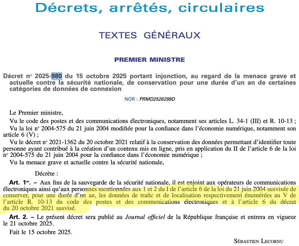 Enfin, l'arrivée du pénible rond-de-cuir Lecornu à Matignon fut l'occasion de pousser un décret obligeant les fournisseurs d'accès à internet et les réseaux sociaux à conserver toute activité de leurs utilisateurs pendant un an. Une «coïncidence», à n'en pas douter.
