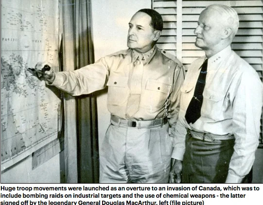 Donald Trump appelle à l'annexion du Canada. Du déjà vu. Le général Douglas MacArthur devait bombardé Vancouver, Halifax, Montréal et Québec. Ce n'est pas une blague.