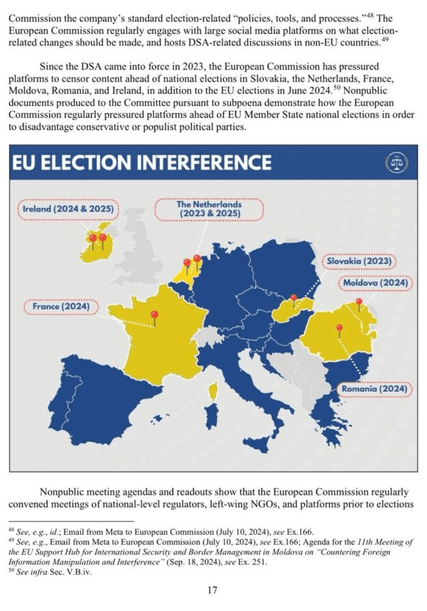 Grâce au House Judiciary Committee for the Republicans, qui a récemment publié l'intégralité des documents auxquels il a eu accès, nous avons même maintenant la preuve que l'Union européenne a activement censuré des contenus pourtant légaux qui chatouillaient sa propagande, et que ces institutions sont intervenues dans au moins huit élections européennes en faisant pression sur les plateformes de réseaux sociaux afin de les pousser à censurer les discours politiques dans les jours précédant le scrutin.