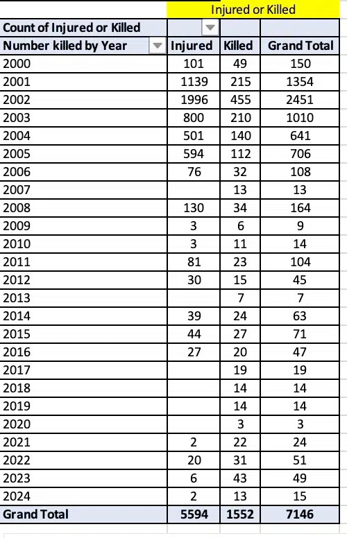 Le nombre d'Israéliens tués et blessés est tout aussi révélateur. Au total, 1 552 Israéliens ont trouvé la mort au cours de cette période de 24 ans et 5 595 ont été blessés. Un examen attentif des données montre que 76 % des décès sont survenus au cours de la période de cinq ans marquée par la deuxième Intifada et que 92 % des blessés ont été enregistrés au cours de cette même période.