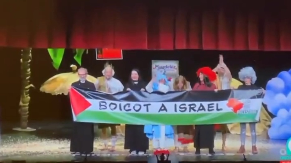 Une banderole portant l'inscription "Boycott Israël" occupe le devant de la scène lors de la finale du "Carnaval de Cadix" dans le théâtre historique "Fala" en Espagne.