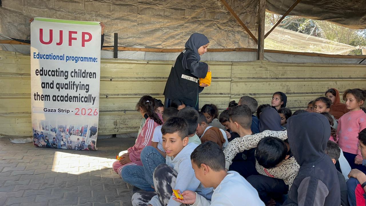 À une courte distance géographique, mais au cœur d'une expérience humaine différente, le centre éducatif de Nuseirat se présente comme un modèle plus large de ce que l'éducation peut être en temps de guerre. Ce centre, supervisé par les équipes de l'UJFP, n'est plus seulement un lieu d'enseignement, mais un espace humain où se croisent apprentissage, soutien psychologique et art. Ici, des élèves d'âges différents se rencontrent - plus de 615 enfants issus de divers niveaux scolaires -, chacun portant une histoire de perte singulière. Certains ont été privés d'éducation pendant de longues périodes, d'autres n'ont connu l'école que dans le contexte du déplacement. C'est pourquoi l'éducation n'est pas imposée comme un fardeau supplémentaire, mais proposée comme un chemin de prise en charge et de protection.