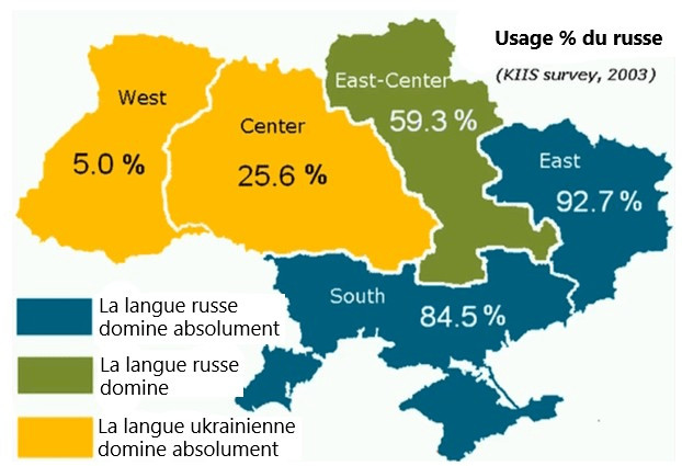 • Mai-juillet 2014 : Adoption par Kiev de lois sur la langue nationale ; un texte supprimant officiellement le statut du russe comme langue régionale est voté. Loi non promulguée mais qui a été largement exploitée politiquement et qui a profondément choqué l'Est du pays.