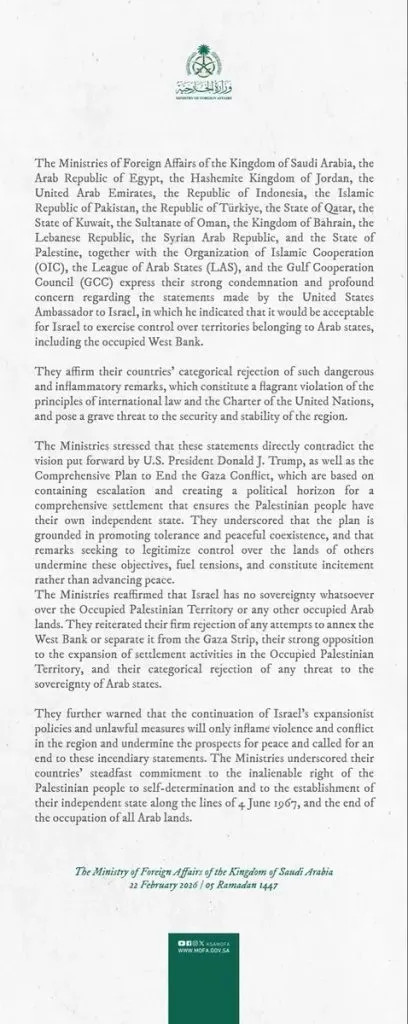 Cette remarque stupide a déclenché une tempête d'indignation de la part de Saudi Arabia, de l'Egypte, de la Jordanie, des United Arab Emirates, de l'Indonésie, du Pakistan, de la Türkiye, du Qatar, du Kuwait, d'Oman, de Bahrain, du Liban, de la Syrie, ainsi que de l'État de Palestine, de l'Organization of Islamic Cooperation, de la League of Arab States et du Gulf Cooperation Council. On ne pouvait pas tomber plus mal en termes de timing.
