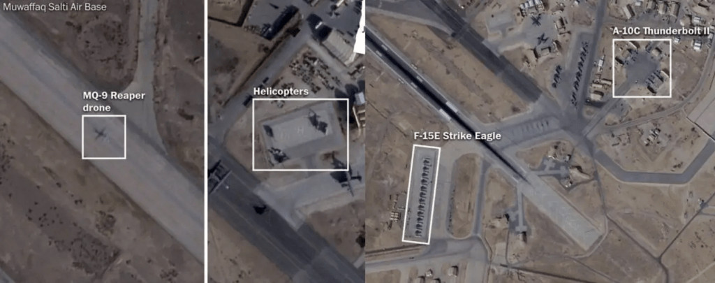 Des drones MQ-9 Reaper, des avions d'opérations spéciales MC-130 et d'autres moyens américains œuvrant pour la paix et la démocratie y sont également stationnés. La base aérienne Prince Sultan en Arabie saoudite étant de plus en plus saturée, toutes ces forces sont redéployées à Muwaffaq Salti, malgré les affirmations d'Amman selon lesquelles son espace aérien ne sera pas utilisé pour des frappes contre l'Iran.