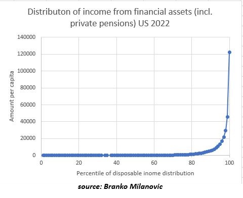 The income generated by capital is concentrated in the few at the top, a power-law distribution: