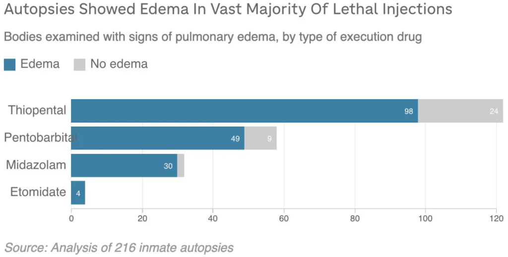 Ces findings étaient consistants quel que soit l'État, le protocole (3 drogues ou single-drug), ou la combinaison (souvent suivie d'un paralysant comme le pancuronium/vecuronium et de chlorure de potassium pour arrêter le cœur). L'œdème survenait fréquemment dès le premier médicament, car les autopsies montraient du liquide mousseux (frothy) dans les voies respiratoires - signe que la personne respirait encore quand les poumons se remplissaient.
