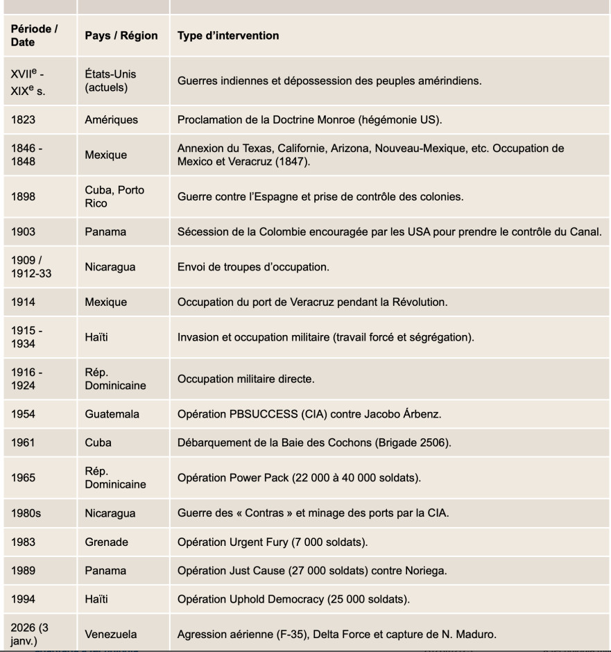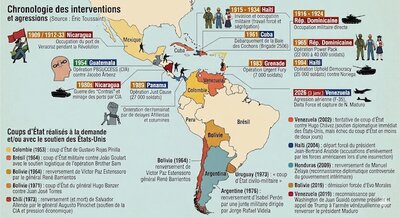 Depuis 1945, les États-Unis ont mené une série d'interventions militaires dans l'hémisphère occidental, alternant opérations clandestines, guerres par procuration et invasions conventionnelles. Je n'aborde ici que les interventions armées directes les plus connues.