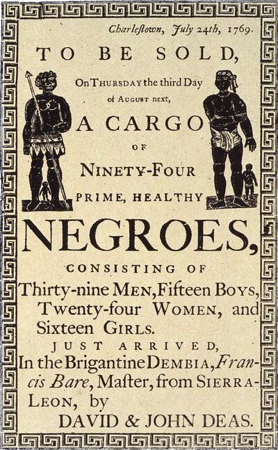 Reproduction d'un prospectus annonçant une vente aux enchères d'esclaves, à Charleston, en Caroline du Sud, en 1769. CC. Wikimedia Commons. picryl.com