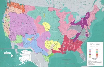Carte reconstituée des zones géographiques où furent parlées les diverses langues des Amérindiens aux États-Unis. Par William C. Sturtevant, Smithsonian Institute, 1967 — 1967 USGS map., Domaine public, commons.wikimedia.org