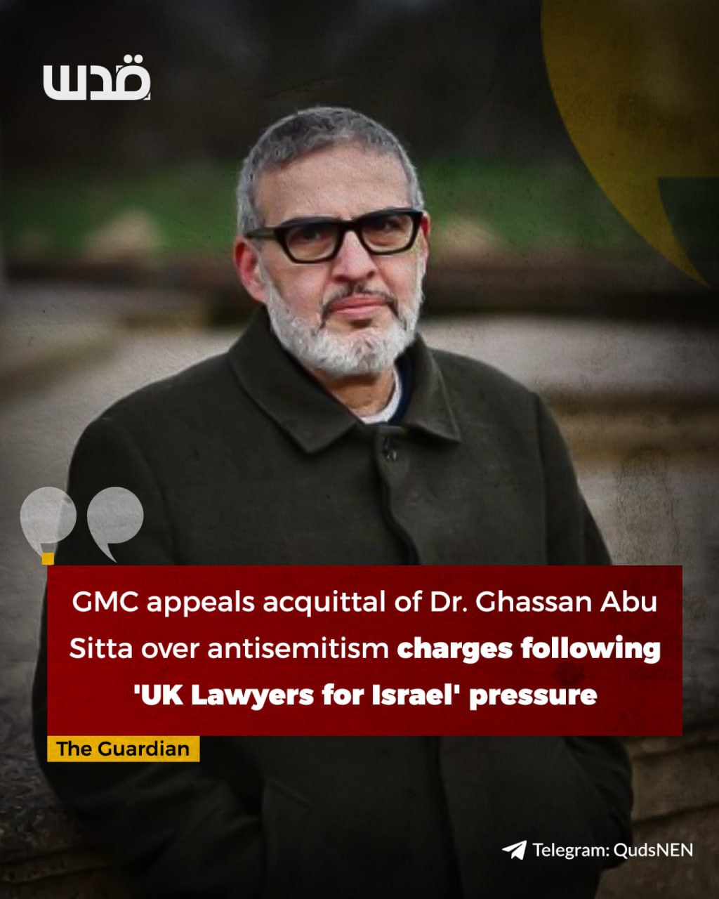 L'affaire a débuté suite à une plainte déposée par l'association UK Lawyers for Israel (UKLFI). Le Dr Ghassan Abu Sitta a qualifié cette manœuvre de tentative d'obtenir un résultat "politiquement acceptable", soulignant l'influence des pressions extérieures sur les décisions des instances de régulation professionnelle.