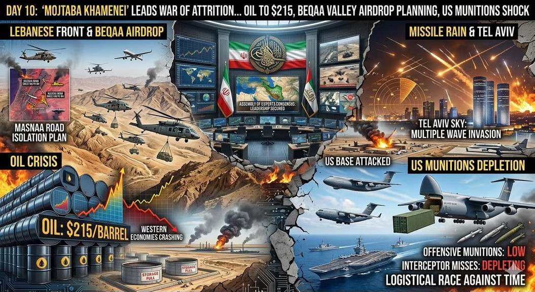 Day 10: "Mojtaba Khamenei" Leads the War of Attrition... Oil Barrels Head Towards $215, Israel Plans an "Airdrop in the Eastern Mountain Range," and Washington is Bleeding Munitions! — Talal Nahle