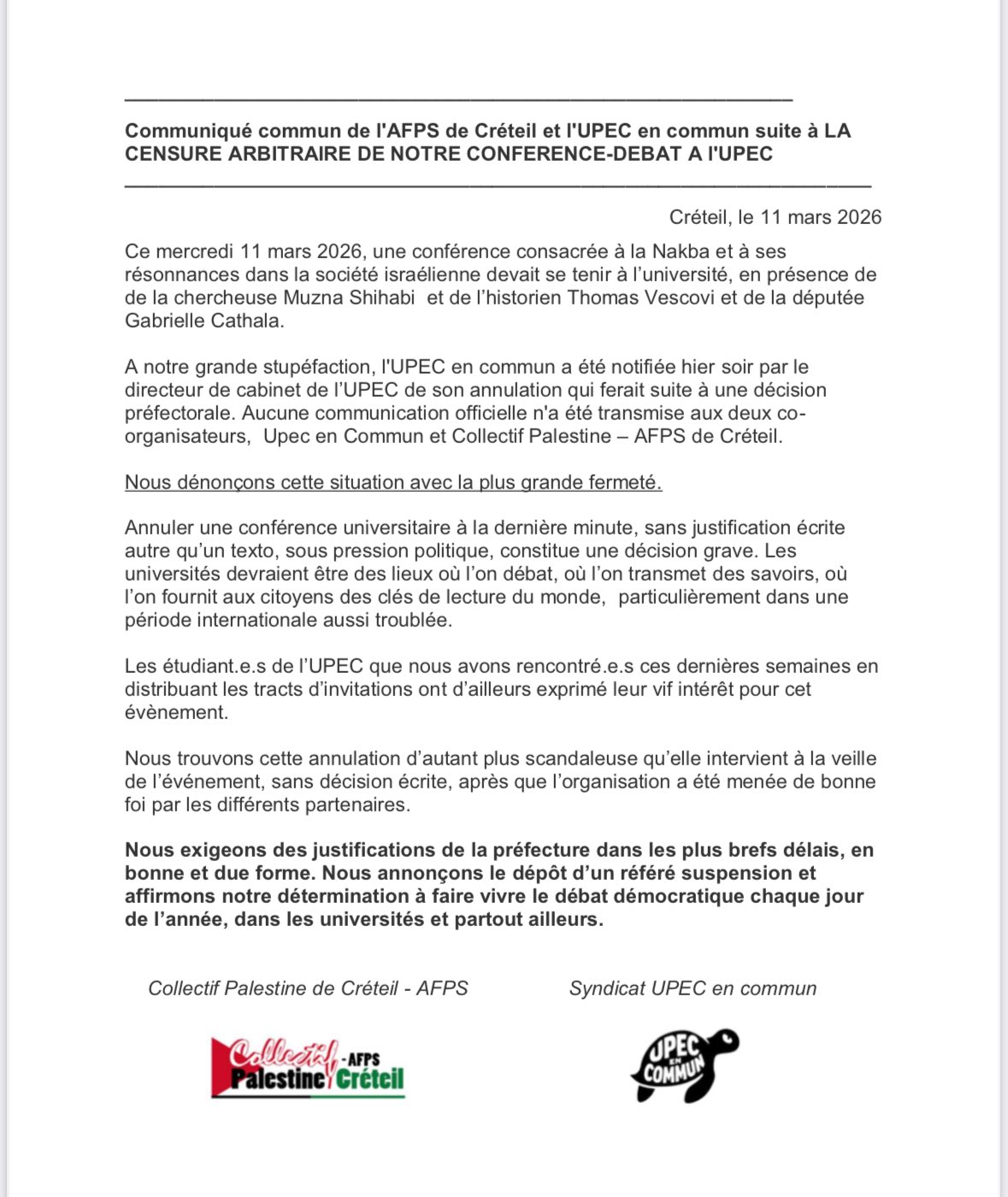Je devais intervenir ce soir à l'Université de Créteil pour une conférence dédiée à la Nakba aux côtés de Muzna Shihabi & Thomas Vescovi.Sans aucun motif et au moyen de procédés inacceptables (annulation moins de 24h avant la conférence, notification de... pic.twitter.com/rQ5hr2gR72