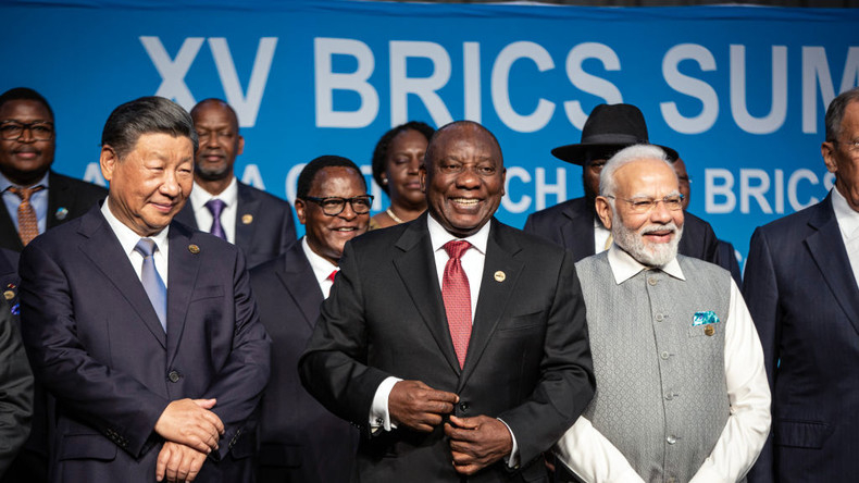 Le président sud-africain Cyril Ramaphosa, accompagné des dirigeants des BRICS, le président chinois Xi Jinping et le Premier ministre indien Narendra Modi, dans une photo de groupe.