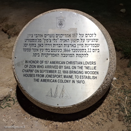 Plaque commémorant l'arrivée de sionistes chrétiens américains à Jaffa en 1866.