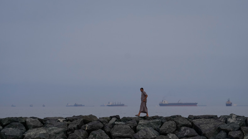 Un homme marche le long du rivage tandis que des pétroliers et des cargos sont alignés dans le détroit d'Ormuz, le 11 mars 2026.