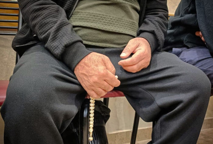 À côté de Saif est assis un homme d'une cinquantaine d'années. Il fait tourner le chapelet, une misbaha, dans sa main, le visage impassible.