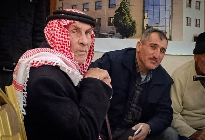 Un homme portant un kufiyyeh rouge est assis dans un silence absolu, comme plongé dans ses pensées. "C'est mon grand-père maternel, il n'a pas encore pris la mesure de la perte de Thaer", explique Saif Hamayel, 26 ans, le frère de Thaer Hamayel, l'une des trois victimes.
