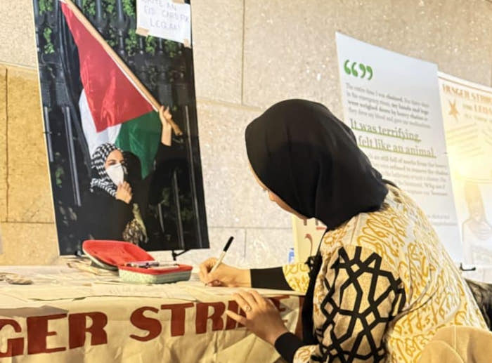 Mahmoud Khalil, le premier manifestant de Columbia à avoir été interpellé, s'est rendu sur place pour soutenir à la fois la 45e semaine consécutive de veillée et le lancement de la grève de la faim, comme l'a  rapporté le journal du campus, The Columbia Inspector.