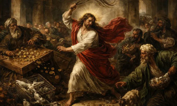 Évangile selon saint Matthieu (21, 12-13) : Jésus entra dans le temple et chassa tous ceux qui y vendaient et y achetaient ; il renversa les tables des changeurs et les sièges de ceux qui vendaient des colombes. Puis il leur dit : "Il est écrit : 'Ma maison sera appelée une maison de prière', mais vous en avez fait une caverne de voleurs".