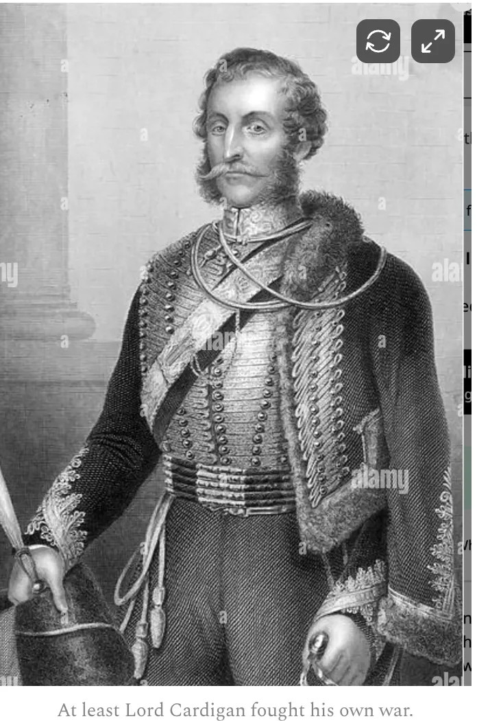 One positive thing that can be said about British and European war up until young Winston's day is that the ruling class that started wars was expected to send their young sons to fight them. My favorite aristocratic warlord in history was James Thomas Brudenell, 7th Earl of Cardigan. He not only used his influence to push hard for the Crimean War, he served on the front line of it.