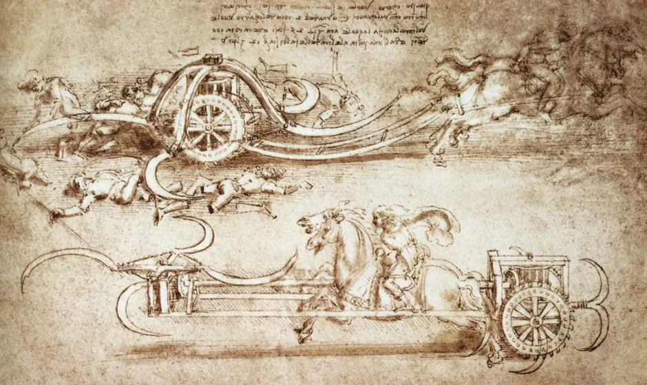 When I was a kid I had a friend who was obsessed with the drawings of Leonardo da Vinci, and one of his favorites was the carro armato con falci - scythed chariot, sometimes referred to as a man harvester.
