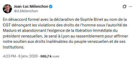 La France insoumise, qui avait réussi à se distancier du discours inepte du "ni Maduro ni Trump" sur le Venezuela et avait dénoncé la position neutraliste de la CGT, reproduit précisément ce travers avec l'Iran, et manifeste une complaisance coupable face au crime sans précédent que constitue l'assassinat d'un dirigeant étranger, servilement qualifié par Mélenchon de " bourreau de son peuple". Il s'agit pourtant d'une violation encore plus grave que l'enlèvement de Maduro, la Convention de l'ONU de 1973 sur la prévention et la répression des infractions contre les personnes jouissant d'une protection internationale (tels que les chefs d'État) définissant comme crime tout acte intentionnel de meurtre, enlèvement ou autre attaque contre la personne ou la liberté d'une telle personne. Ce faisant, Mélenchon reprend la propagande américano-sioniste et balaie d'un revers de main les millions d'Iraniens qui le vénèrent et le considèrent comme leur chef politique et spirituel, leur niant leurs"droits inaliénables" et le respect de leurs institutions.