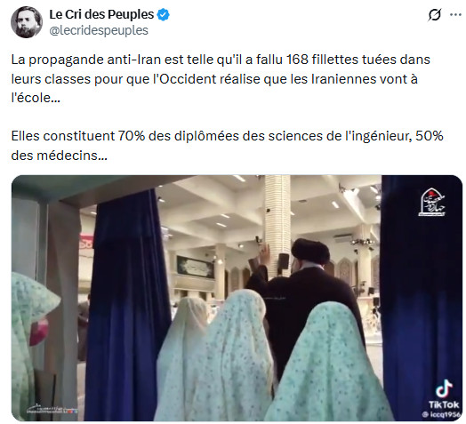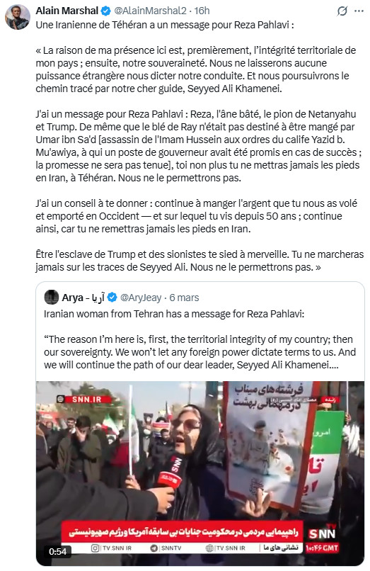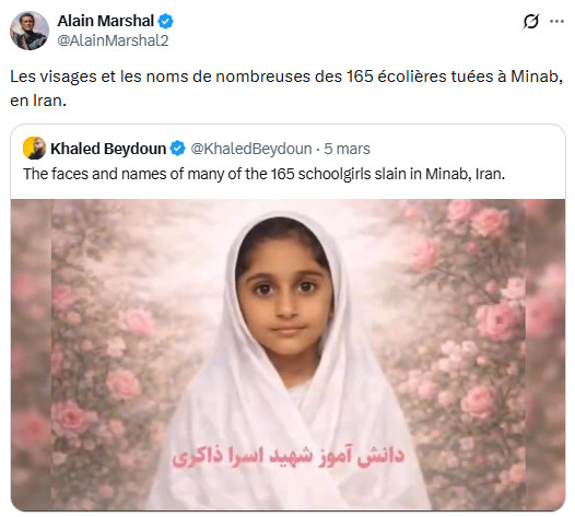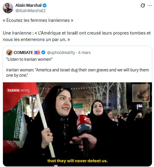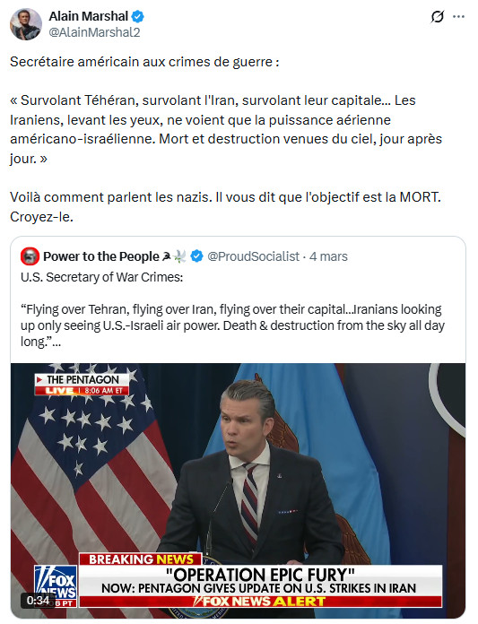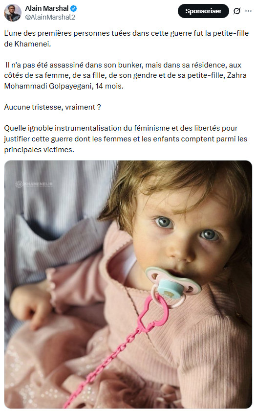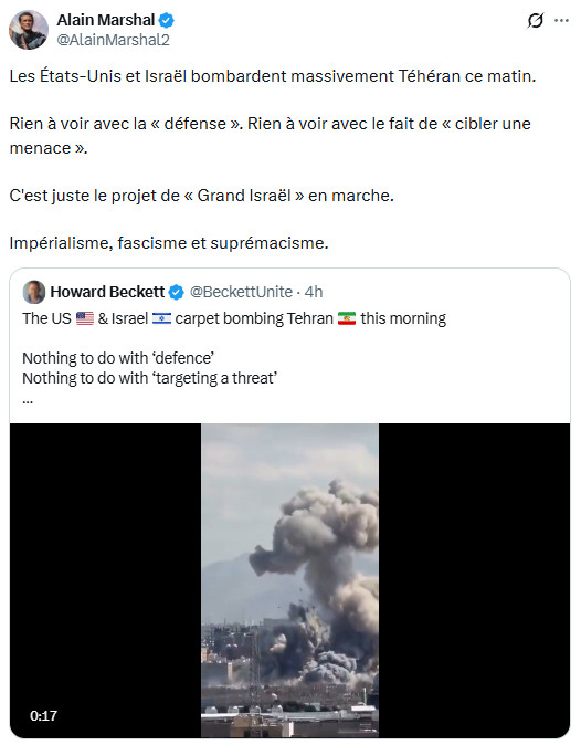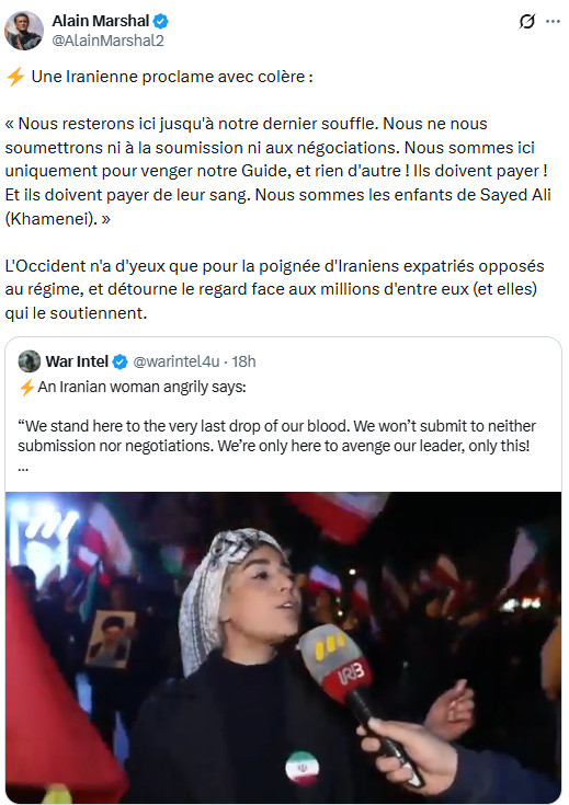 Ceux qui ont diabolisé l'Iran comme une "dictature des mollahs", allant jusqu'à inventer de toutes pièces un prétendu "suprémacisme iranien" ( falsification grossière de Jean-Luc Mélenchon qui vise à imputer à l'Iran des visées hégémoniques et expansionnistes, renvoyant ainsi dos à dos les agresseurs et l'agressé, comme si on pouvait mettre sur le même plan plusieurs décennies d'agressions génocidaires et de simples intentions alléguées), portent une lourde responsabilité : ils ont préparé l'opinion à cette agression en l'aveuglant sur la véritable nature de la République islamique et de la société iranienne, et en validant les éléments de langage de la machine de guerre américano-sioniste. Si l'Iran devait être vaincu (ce qui, heureusement, est extrêmement improbable), cette machine morbide, possédée par la folie mystique qu'elle prétend combattre pour défendre la "civilisation occidentale", verrait ses appétits libérés sur un monde livré à la loi de la jungle.