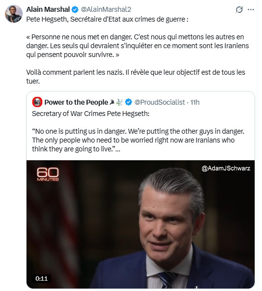 L'absence de "règles d'engagement" évoquée par Hegseth signifie que les États-Unis reconnaissent désormais ouvertement que l'ensemble de l'Iran est devenu une zone de tir libre, comme Gaza l'était déjà.