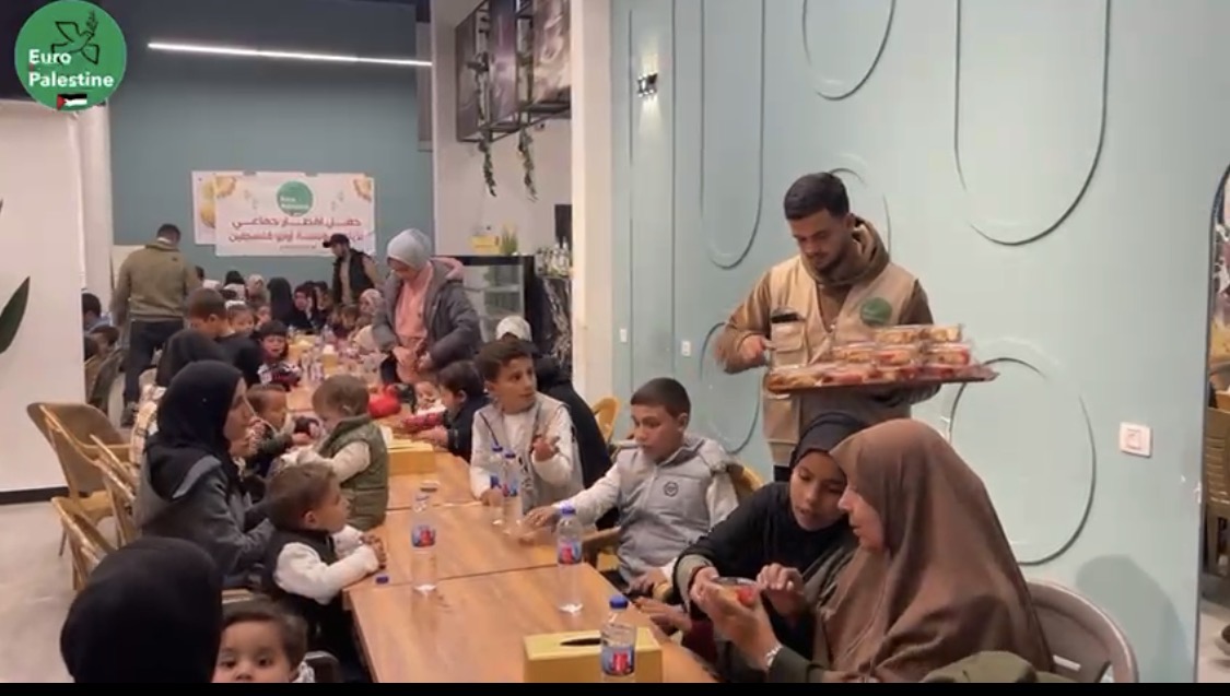 video.europalestine.com"En fait, nous avons servi 75 repas (shawarma, eau, dattes, amuse-gueules, boisson et pâtisseries) pour ces enfants de Gaza (Nord) et de leurs accompagnants et responsables)"