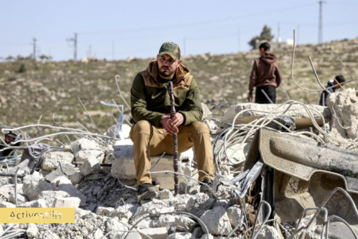 18 février 2026 - Un Palestinien est assis au milieu des ruines de son immeuble démoli près de la colonie israélienne de Haggai, dans le village de Qalqas en Cisjordanie, au sud d'Hébron, après que celui-ci a été démoli par les forces israéliennes. L'immeuble comprenait dix appartements et abritait cinquante personnes - Photo : Mosab Shawer / Activestills