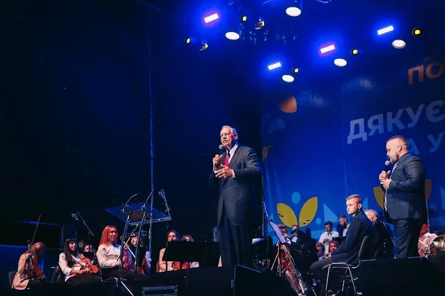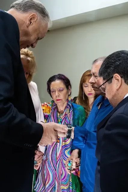 Ralph Drollinger, qui a renoncé à une carrière prometteuse de basketteur pour devenir prêcheur, est devenu un agent itinérant d'influence politique de la Maison Blanche, de l'Ukraine au Nicaragua. Ci-dessus, il parle à une célébration de Thanksgiving à Kiev, devant 50 000 participants en octobre 2019. Ci-dessous, il anime un groupe de prière avec Daniel Ortega et Rosario Murillo, le couple présidentiel, à Managua, durant l'été 2019, où il était l'un des invités d'honneur de la célébration du 40ème anniversaire de la révolution sandiniste ()