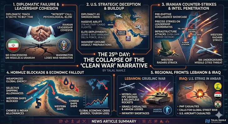 Alors que le conflit entre dans son 25e jour, la réalité sous-jacente des "négociations" apparaît au grand jour. L'alliance américano-israélienne utilise les pourparlers diplomatiques comme une manœuvre de diversion stratégique pour masquer l'un des plus importants renforcements militaires de l'histoire moderne du Moyen-Orient, tandis que l'Iran riposte par une infiltration massive des services du renseignement, une guerre économique et des frappes militaires de précision.