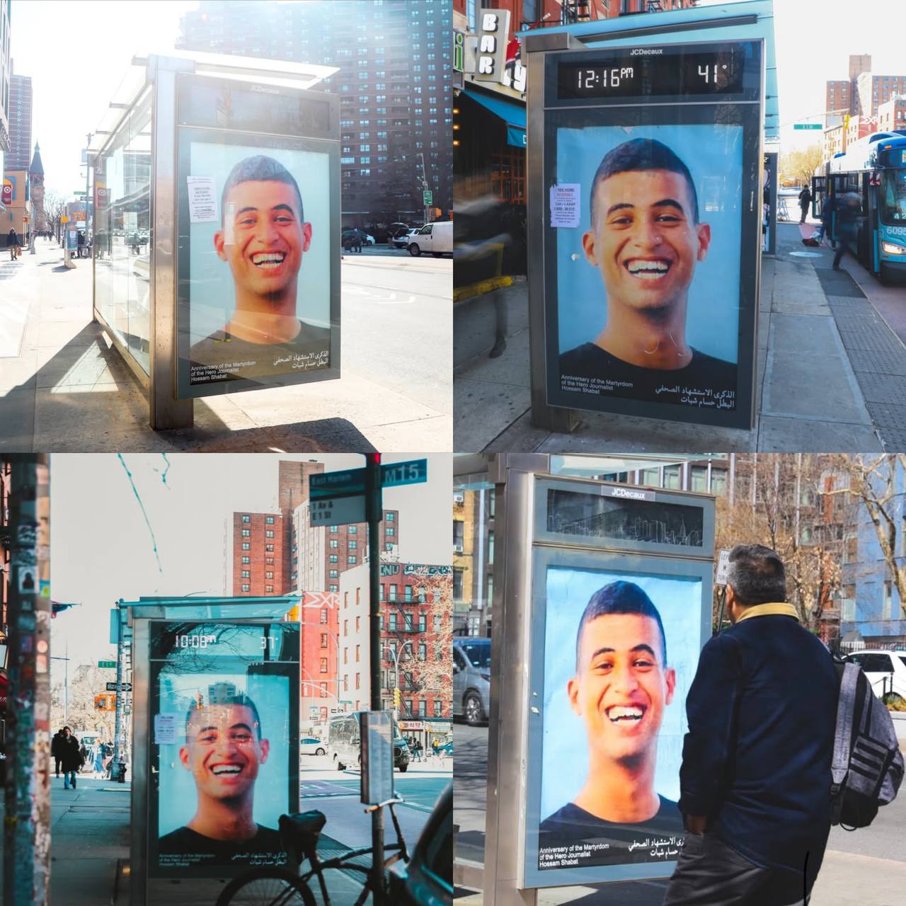 À l'occasion de l'"anniversaire" de son assassinat par Israël dans le nord de Gaza, des affiches rendant hommage au journaliste palestinien Hossam Shabat, âgé de 23 ans, ont été placardées dans les rues de New York.