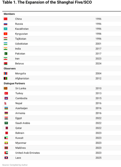 Cinq ans après la chute de l'Union soviétique, les dirigeants de la Chine, de la Russie et de trois des nouveaux États indépendants d'Asie centrale - le Kazakhstan, le Kirghizistan et le Tadjikistan - ont créé le Groupe de Shanghai. Son rôle principal était d'améliorer la sécurité collective de ces cinq États en luttant contre les "trois fléaux" : le séparatisme, le terrorisme et l'extrémisme. En 2001, l'Ouzbékistan est devenu le sixième membre et l'organisation a pris officiellement le nom d'OCS. La Mongolie a obtenu le statut d'observateur en 2004, suivie de l'Afghanistan en 2012. En 2008, l'OCS a lancé un appel à candidatures pour devenir partenaire de dialogue. En 2017, elle a accueilli ses premiers nouveaux membres depuis 2001, l'Inde et le Pakistan, suivis de l'Iran en 2023 et du Bélarus en 2024 (voir tableau 1).