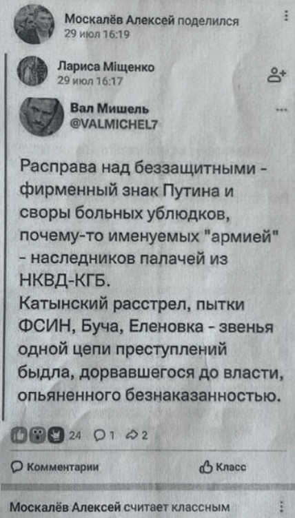 Il a aussi marqué comme "classe" un post où il est écrit : "S'acharner sur les sans-défense - c'est la marque de fabrique de Poutine et de sa meute de salauds malades qu'on appelle étrangement "armée", héritiers des bourreaux du NKVD-KGB. L'exécution de Katyń, les tortures du FSIN, Boutcha, Elenovka - autant de maillons d'une même chaîne de crimes commis par des brutes assoiffées de pouvoir et ivres d'impunité".