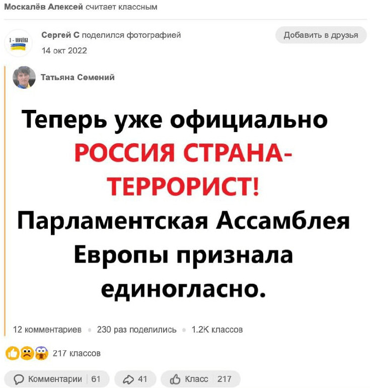 Moskaliov a ainsi marqué comme "classe" un post où il est écrit que "la Russie est un État terroriste".