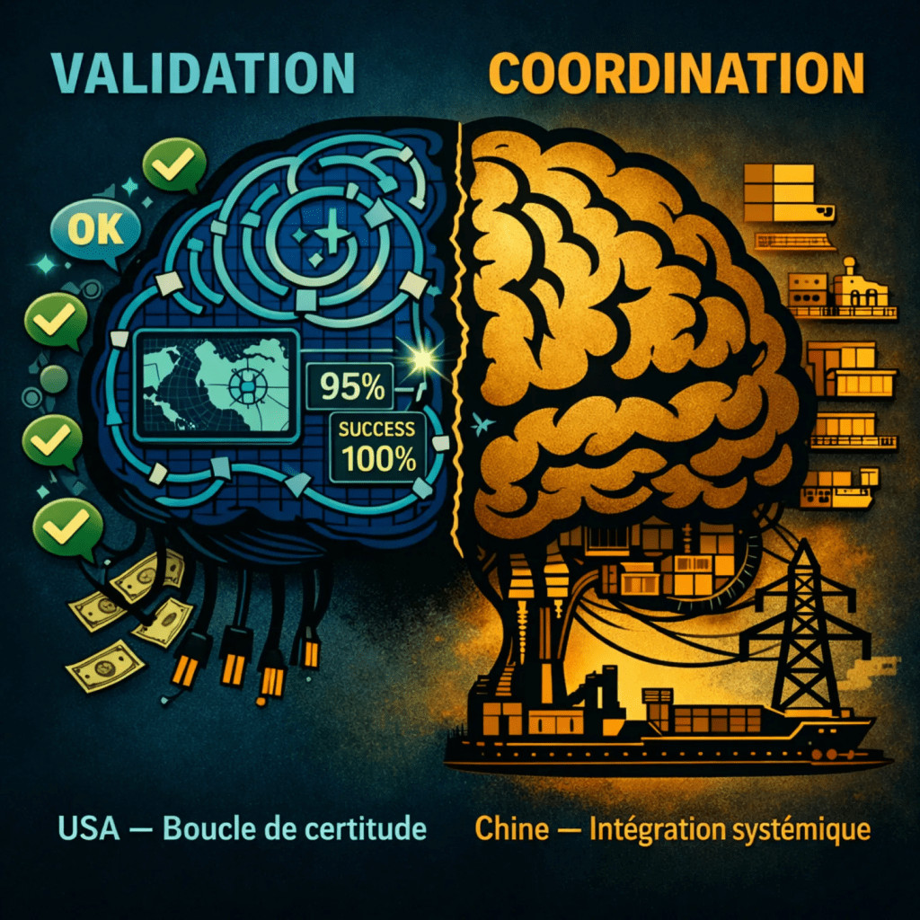 L'USAmérique construit des intelligences qui parlent à leurs utilisateurs ; la Chine construit des intelligences qui parlent à leurs systèmes. La première excelle dans la production de discours cohérents et de projections convaincantes ; la seconde dans l'organisation silencieuse des flux matériels. L'une valide les certitudes du commandement ; l'autre les confronte à la résistance des chaînes logistiques.
