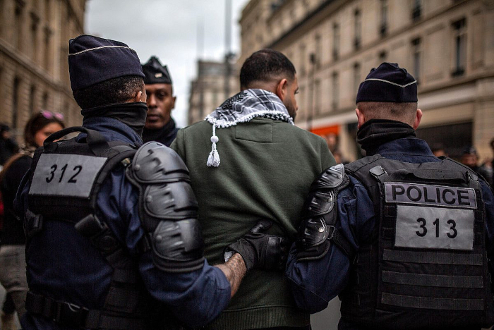 14 octobre 2023 - La police française réprime une manifestation à Paris en solidarité avec le peuple palestinien et contre l'offensive israélienne sur Gaza, le 14 octobre 2023 - Photo : Anne Paq / Activestills