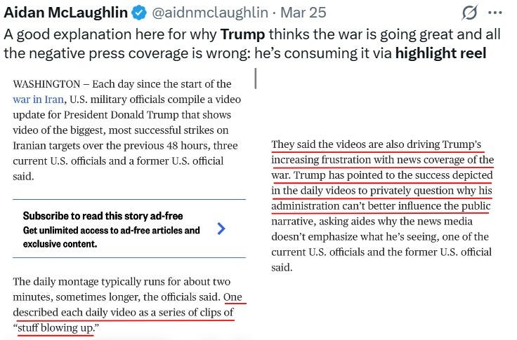 In support of this striking possibility, the media has reported that Trump's understanding of the state of the war may mostly be based upon a daily highlight video reel he's been receiving, one that shows the explosions of our biggest, most successful strikes on Iranian targets. So instead of being totally delusional or dishonest, many of his strange statements may be because he's just so stupid that he believes whatever his various aides are telling and showing him.