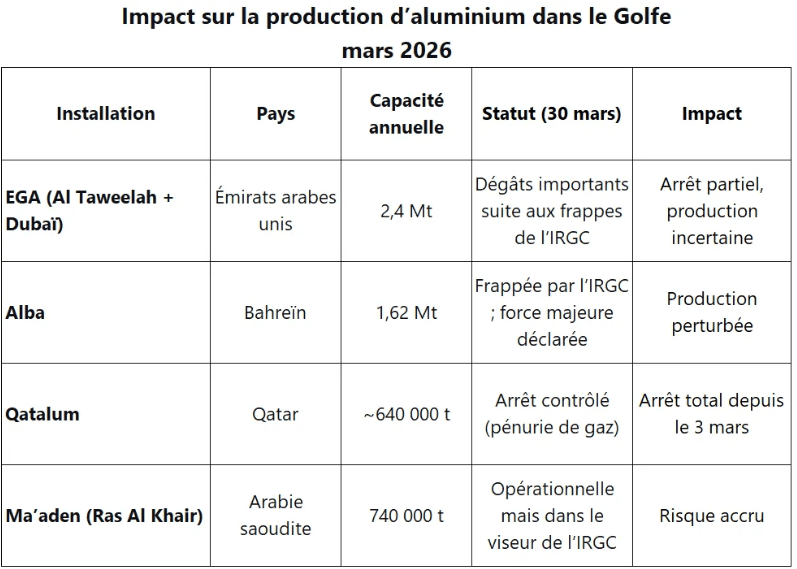 Les frappes du 29 mars ont accéléré une crise d'approvisionnement en aluminium qui couvait depuis le début de la guerre le 28 février. Les États du Golfe produisent environ 8% de l'aluminium primaire mondial, selon l'International Aluminium Institute. Si l'on exclut la Chine et la Russie du dénominateur - ce que les chaînes d'approvisionnement occidentales doivent effectivement faire - cette part dépasse 20%. Le Golfe n'est pas un fournisseur marginal, mais un maillon essentiel du marché de l'aluminium non chinois et non russe.